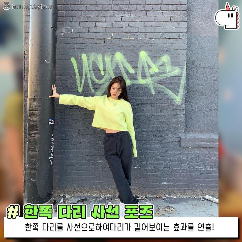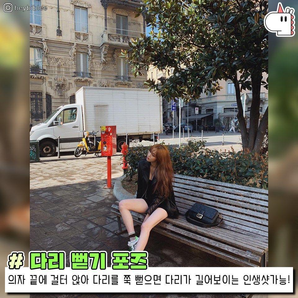 This pose also makes your body look longer and slimmer! When you're taking photos standing up, bring one leg over the other and stretch it out as far as you can, while slightly slanting your body.